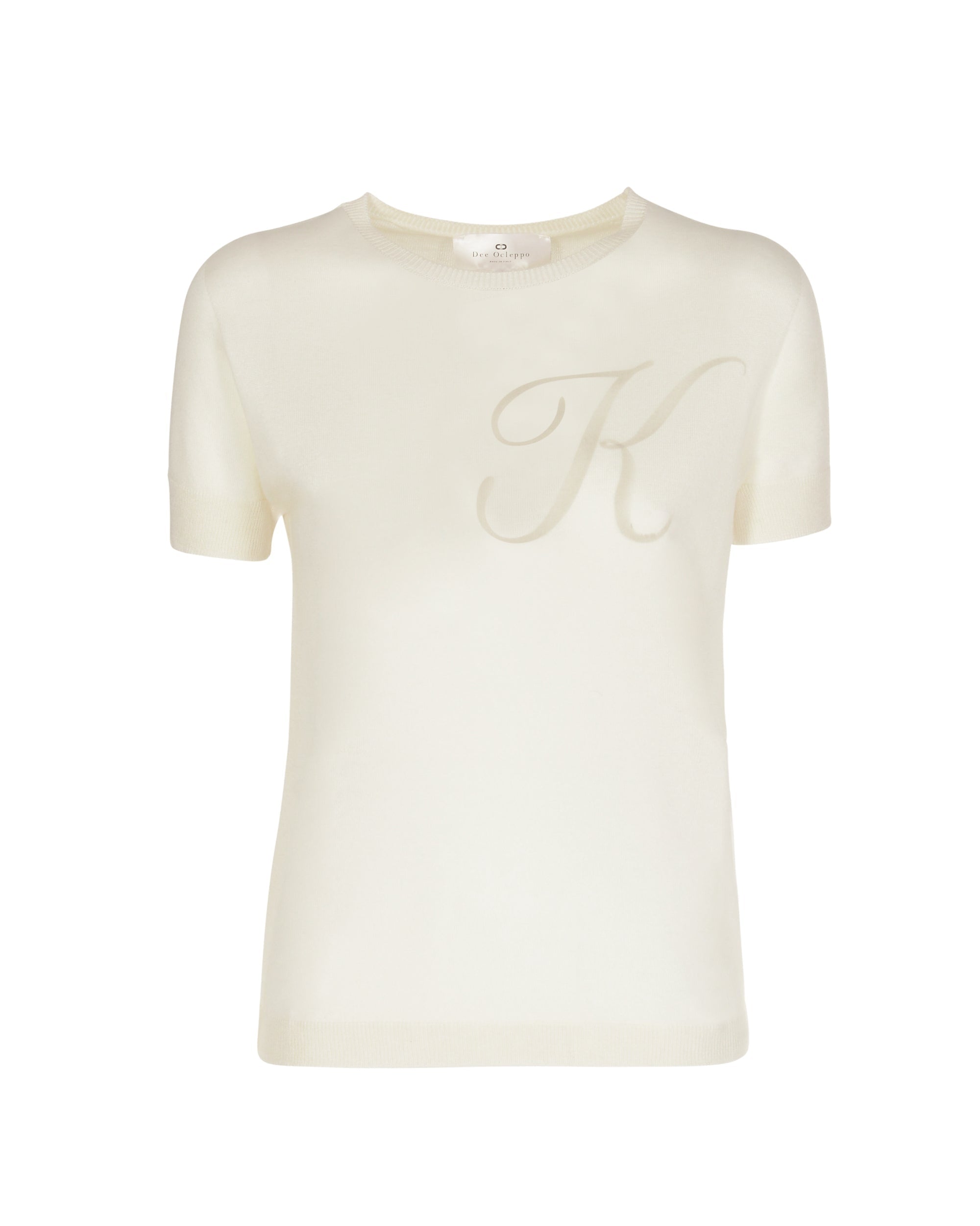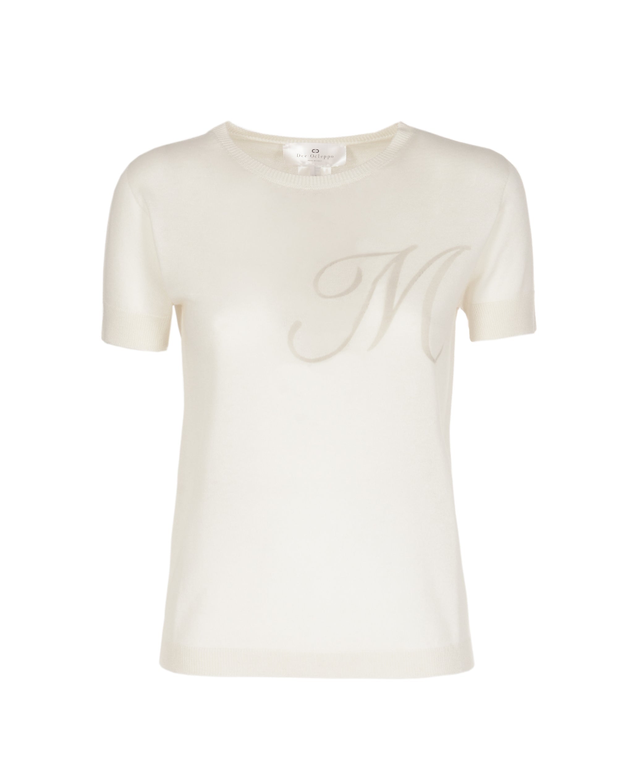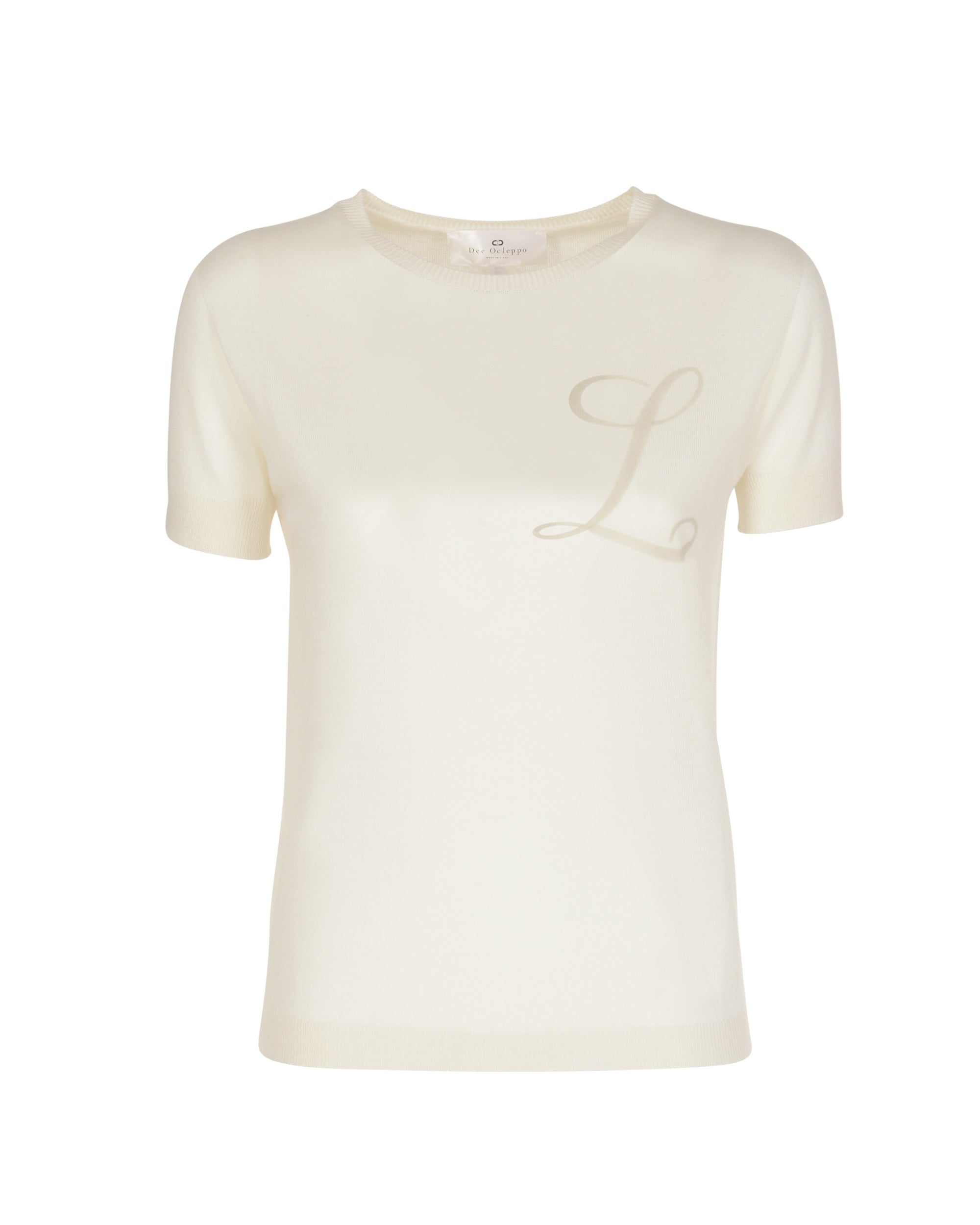 Feel the touch of our 16 gauge silk and cashmere Summer crew neck T-Shirt. Light enough for Summer months  this lightweight crew neck T-Shirt deserves a place in your capsule wardrobe for all seasons. With a ribbed finish on the cuffs and hemline and with a contrasting letter on the front this sweater is perfect for off-duty dressing , travelling and also works well with your workday wardrobe. Choose your Letter from: A-C-D-J-K-L-M-N-P-STrue to size - Straight fit - Falls to hip55 % Silk and 45% Cashmere Made in ItalyDry Clean/Hand wash coolExtrafine Light weight 16 gage CashmereMulberry Silk