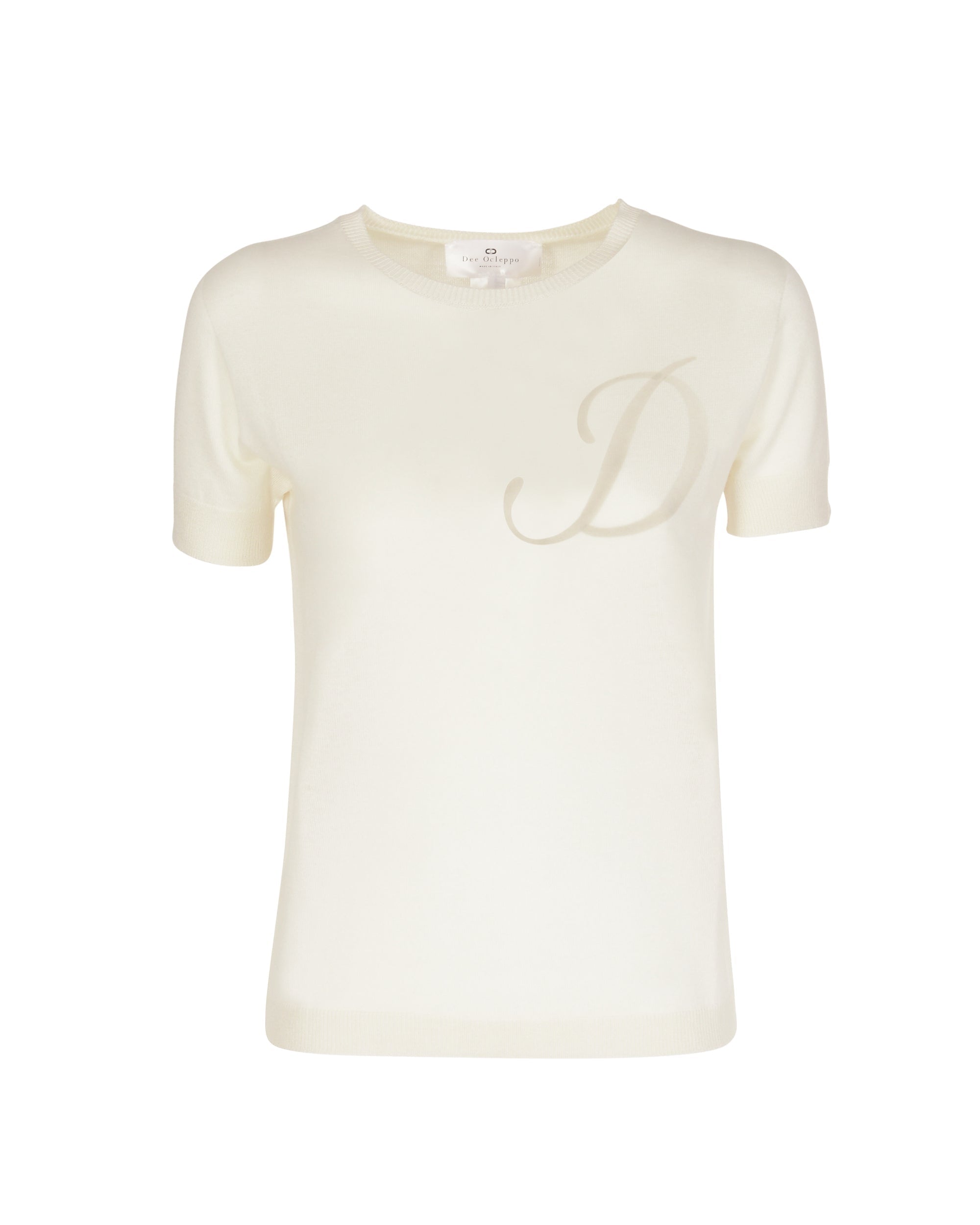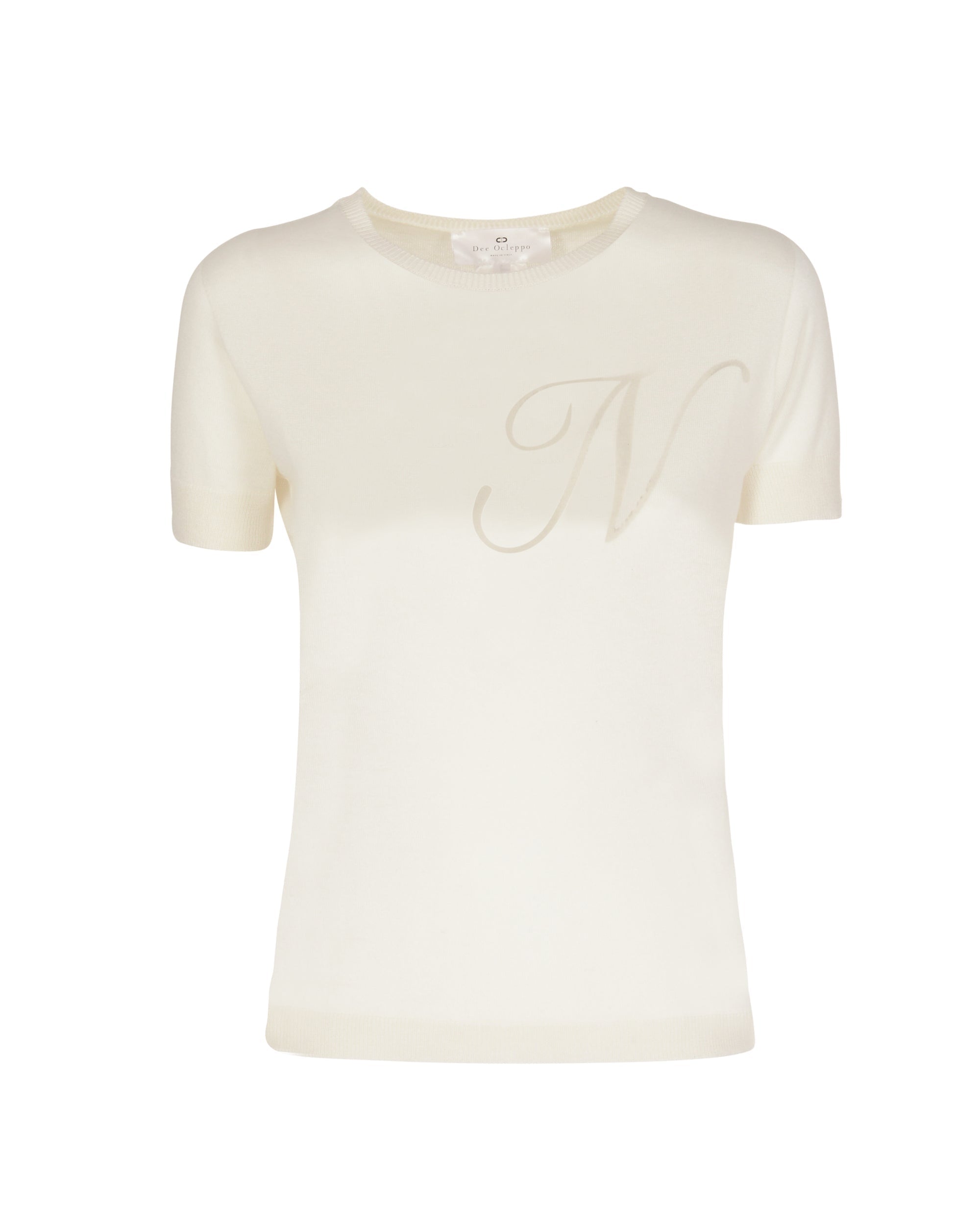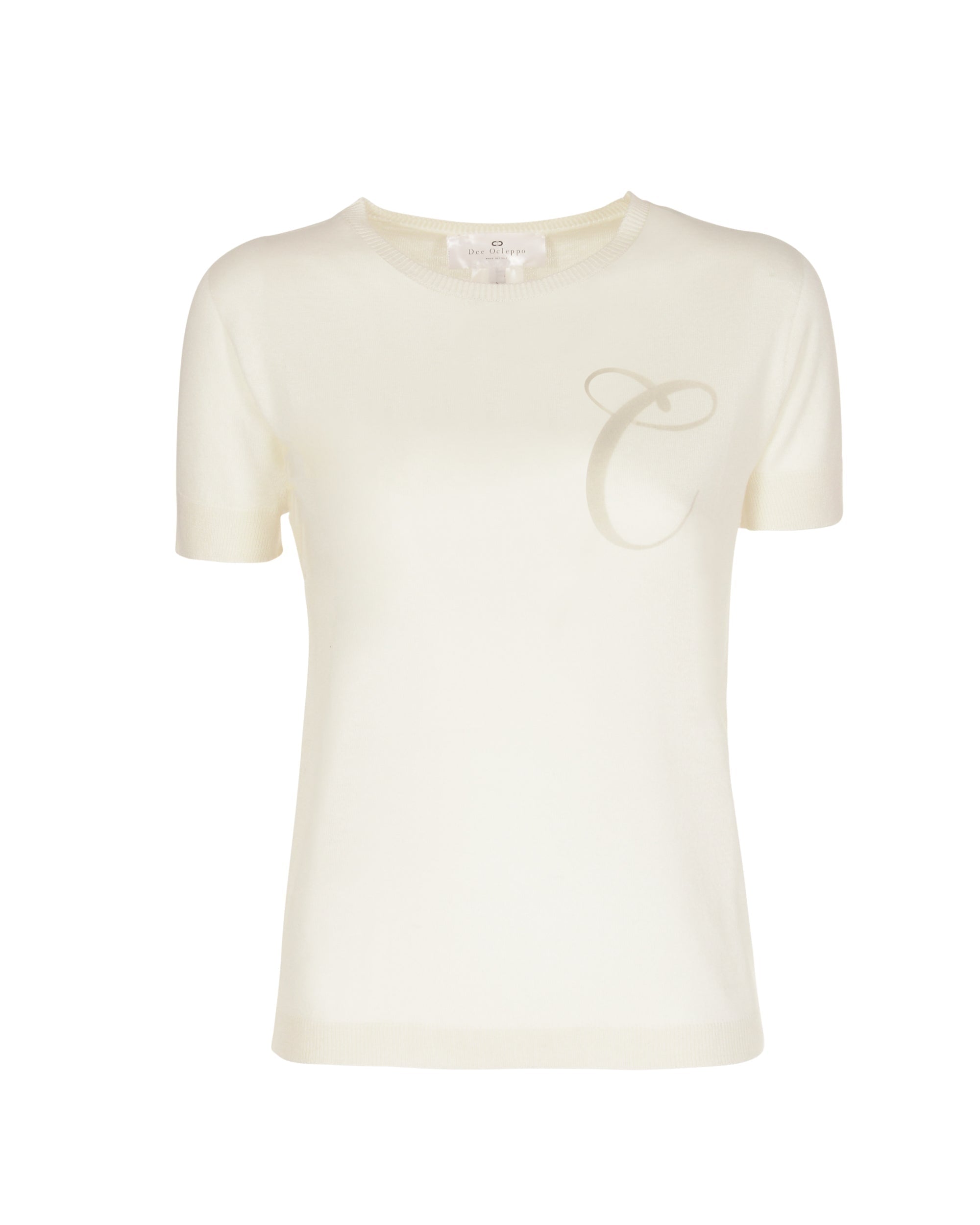 Feel the touch of our 16 gauge silk and cashmere Summer crew neck T-Shirt. Light enough for Summer months  this lightweight crew neck T-Shirt deserves a place in your capsule wardrobe for all seasons. With a ribbed finish on the cuffs and hemline and with a contrasting letter on the front this sweater is perfect for off-duty dressing , travelling and also works well with your workday wardrobe. Choose your Letter from: A-C-D-J-K-L-M-N-P-STrue to size - Straight fit - Falls to hip55 % Silk and 45% Cashmere Made in ItalyDry Clean/Hand wash coolExtrafine Light weight 16 gage CashmereMulberry Silk
